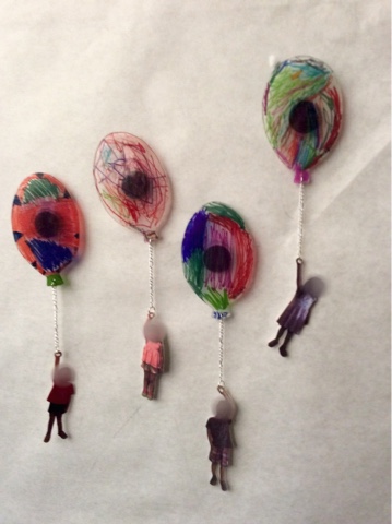 The first part is getting the shrink plastic, or Shinky Dinks, and cutting out a ballon shape. These ballon where about half a sheet big. The kids then colored them in.